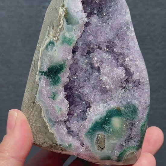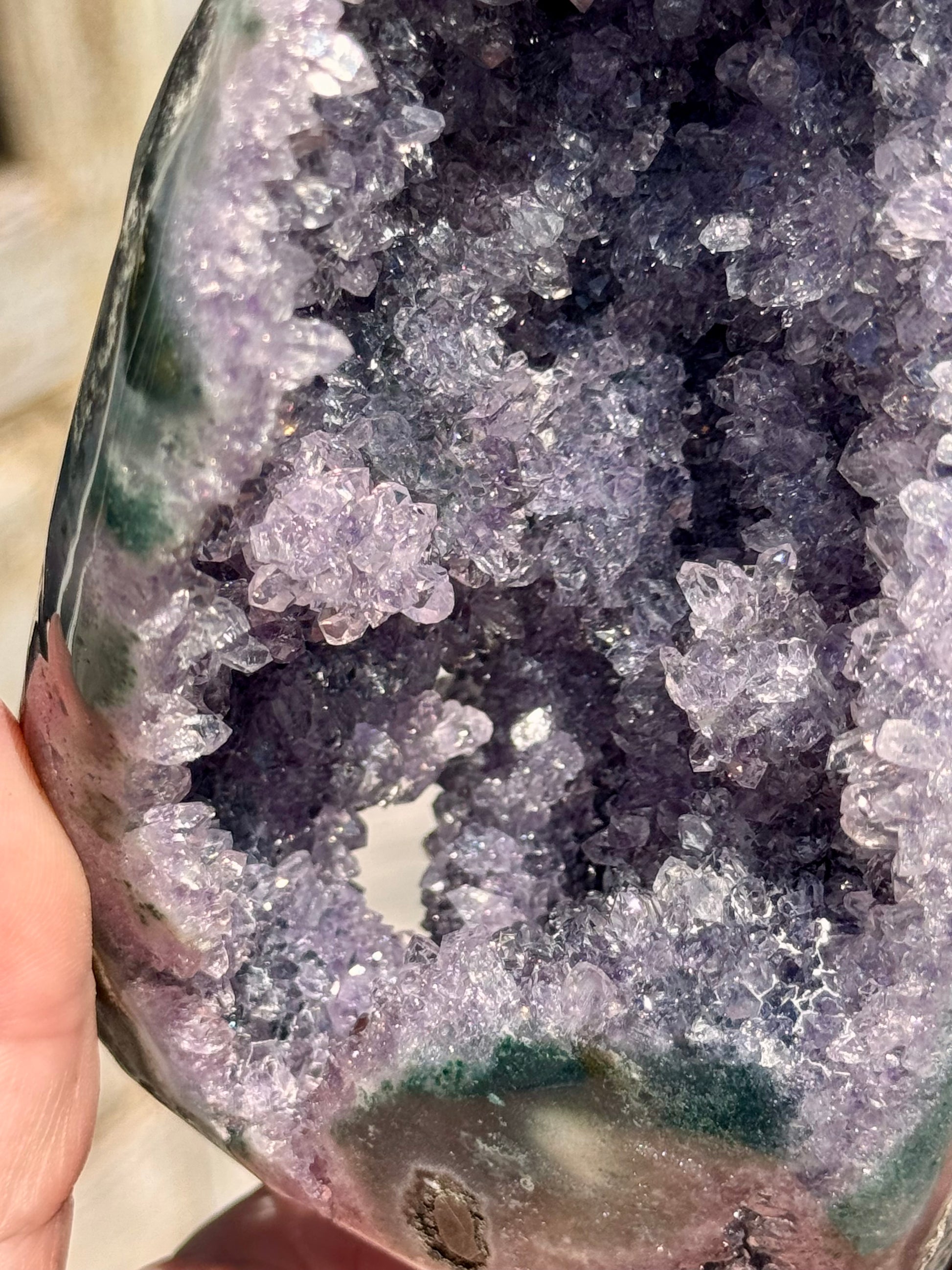This breathtaking Lilac Amethyst cluster features a wrap-around geode formation with beautifully defined, super clear crystal points and a natural opening at the base. The geode continues around the back, framed by a stunning border of green agate that adds depth and contrast. At the front, delicate stalactite flower formations and soft lavender tones make this piece truly one of a kind. Sourced from Brazil, it embodies the serene beauty and calming energy Amethyst is loved for—bringing peace, balance, and high-vibrational energy to any space. Perfect as a statement display, meditation piece, or meaningful gift for any crystal enthusiast.