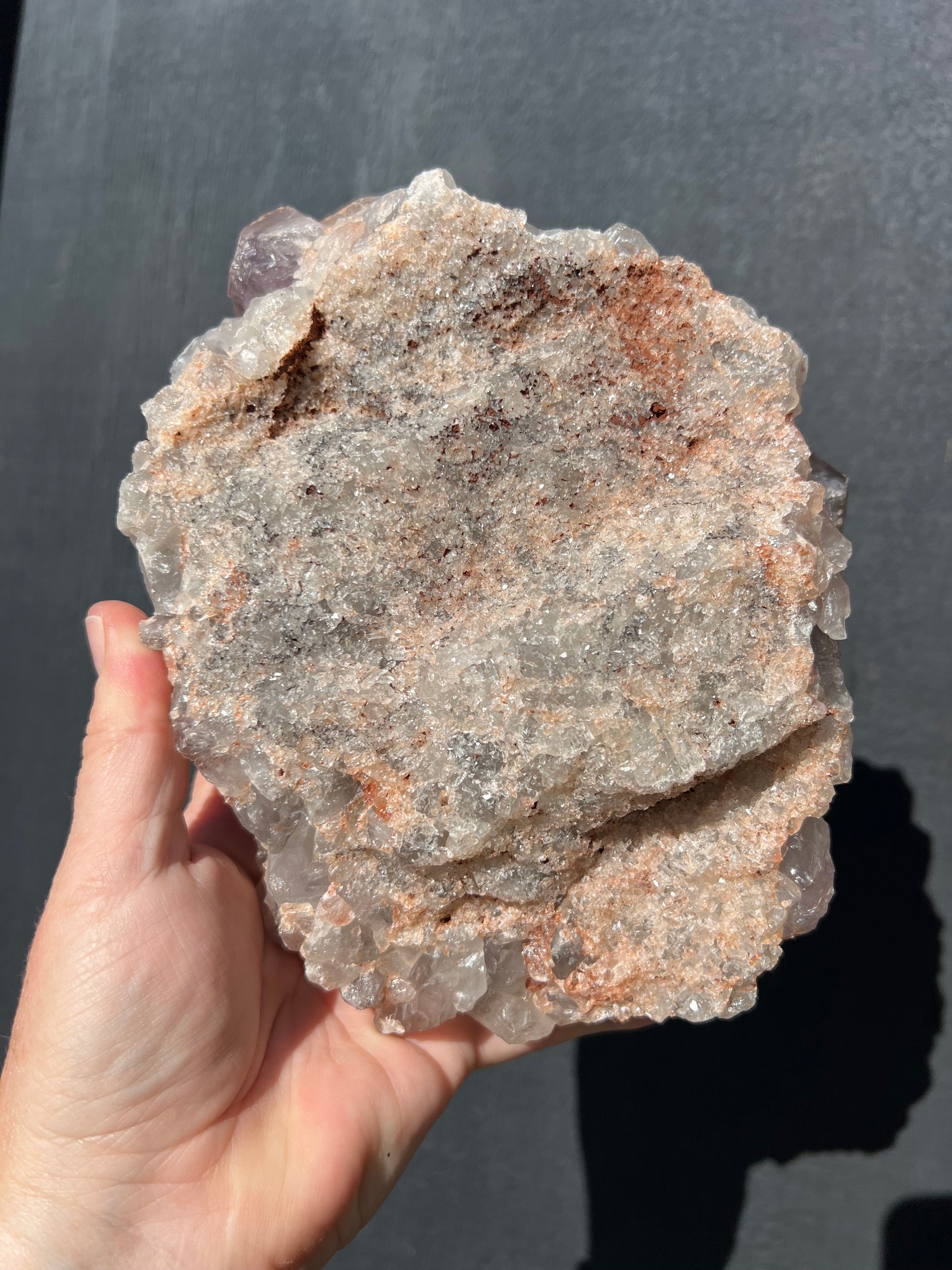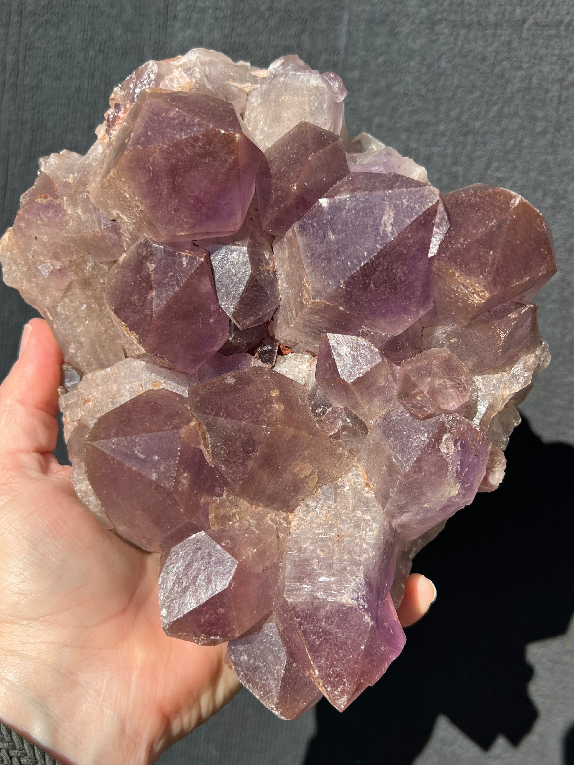 This incredibly unique large piece has beautiful purple colour with a natural red Hematite patina over the beautiful extra large points. Really amazing big cluster and very unique to see where its come off the host rock. With the know how a light acid wash would reveal the gorgeous Amethyst under the hematite coating.