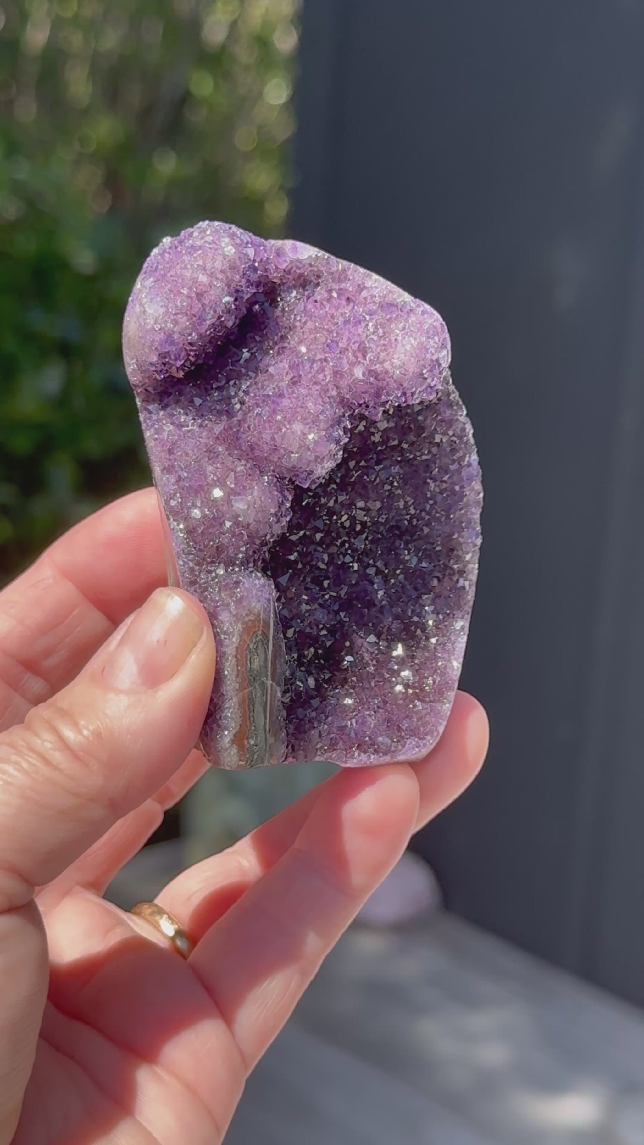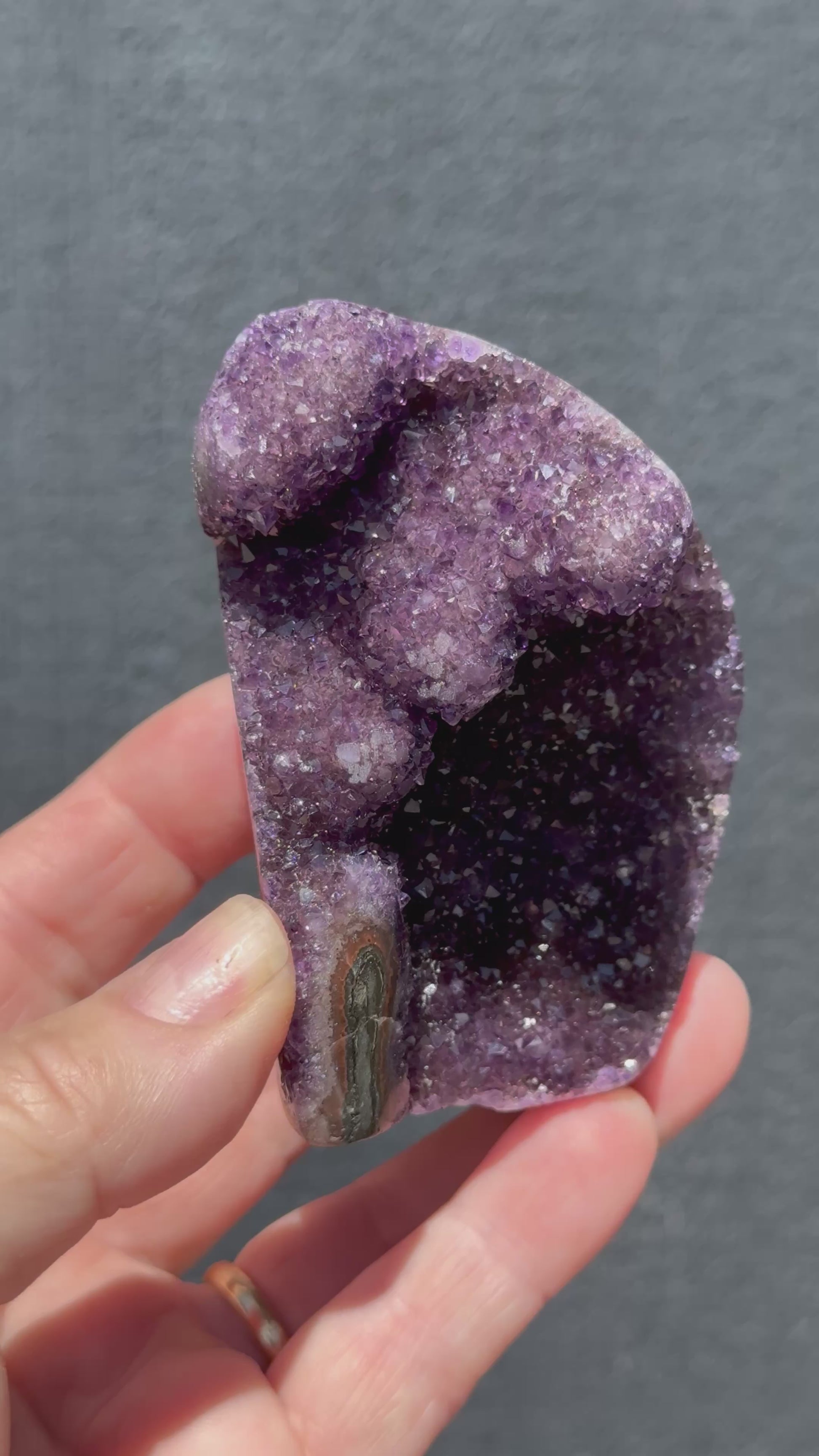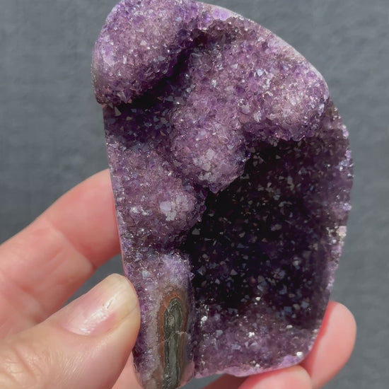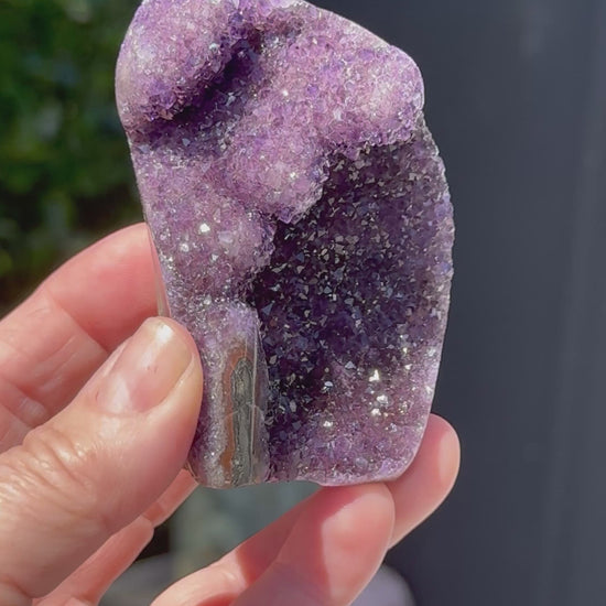 This beautiful high-grade Amethyst cluster is truly one of a kind, featuring captivating stalactite formations and beautifully polished edges that highlight its natural charm. Sourced from Brazil, this piece highlights the delicate beauty and serene energy Amethyst is known for—bringing calm, balance, and spiritual harmony to any space. Perfect as a display piece, meditation companion, or thoughtful gift for any crystal lover.