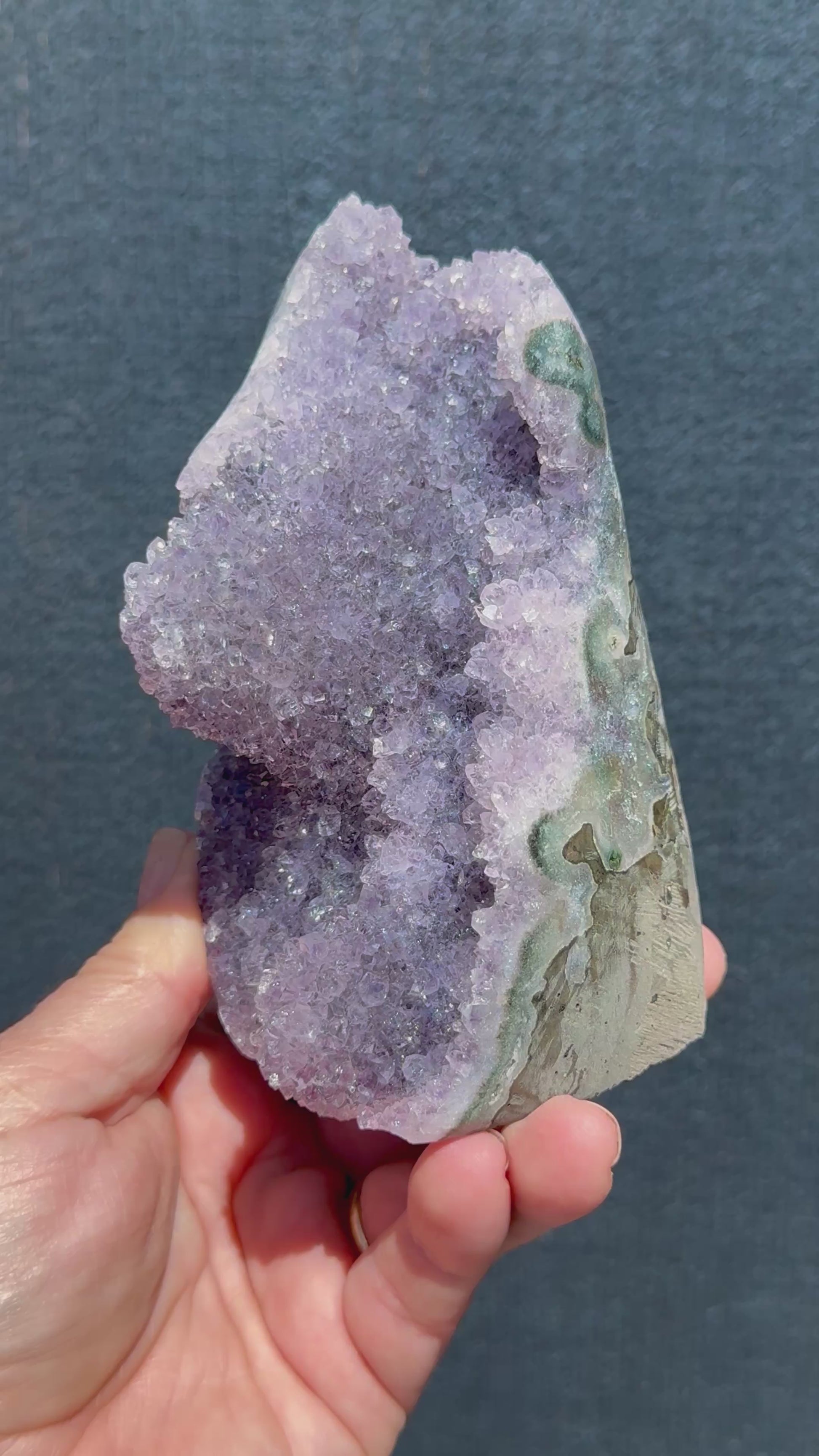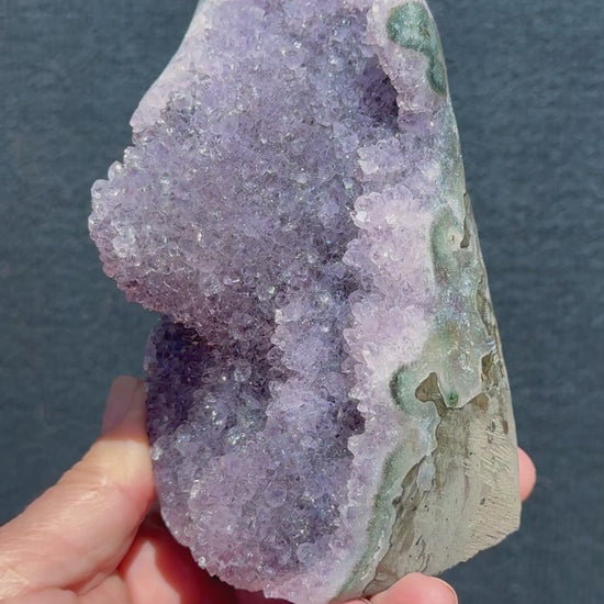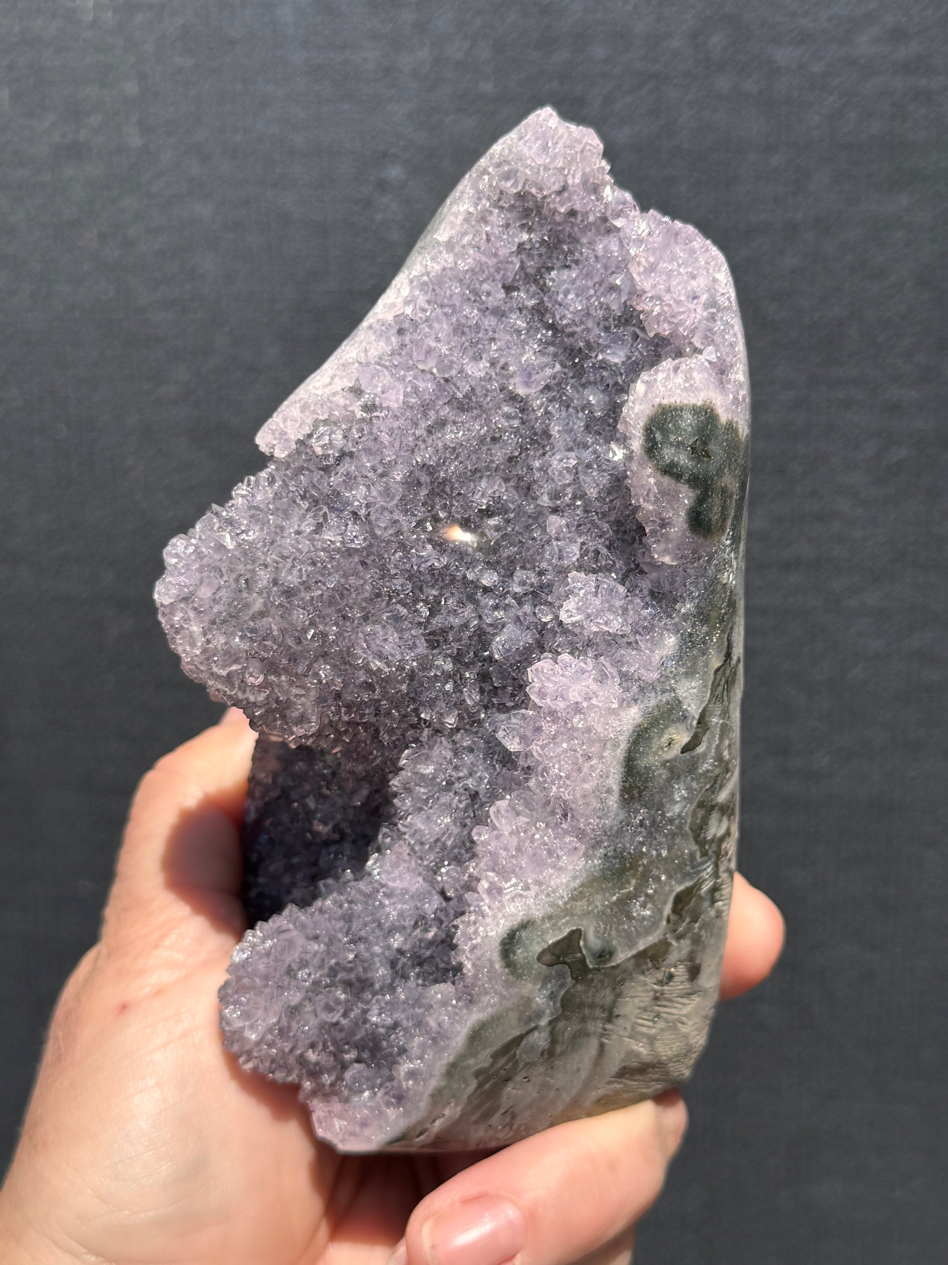 This stunning Lilac Amethyst cluster showcases soft lavender tones and beautiful natural stalactite formations that make it truly unique. Each crystal point shimmers with gentle clarity, creating a soothing, high-vibrational presence.