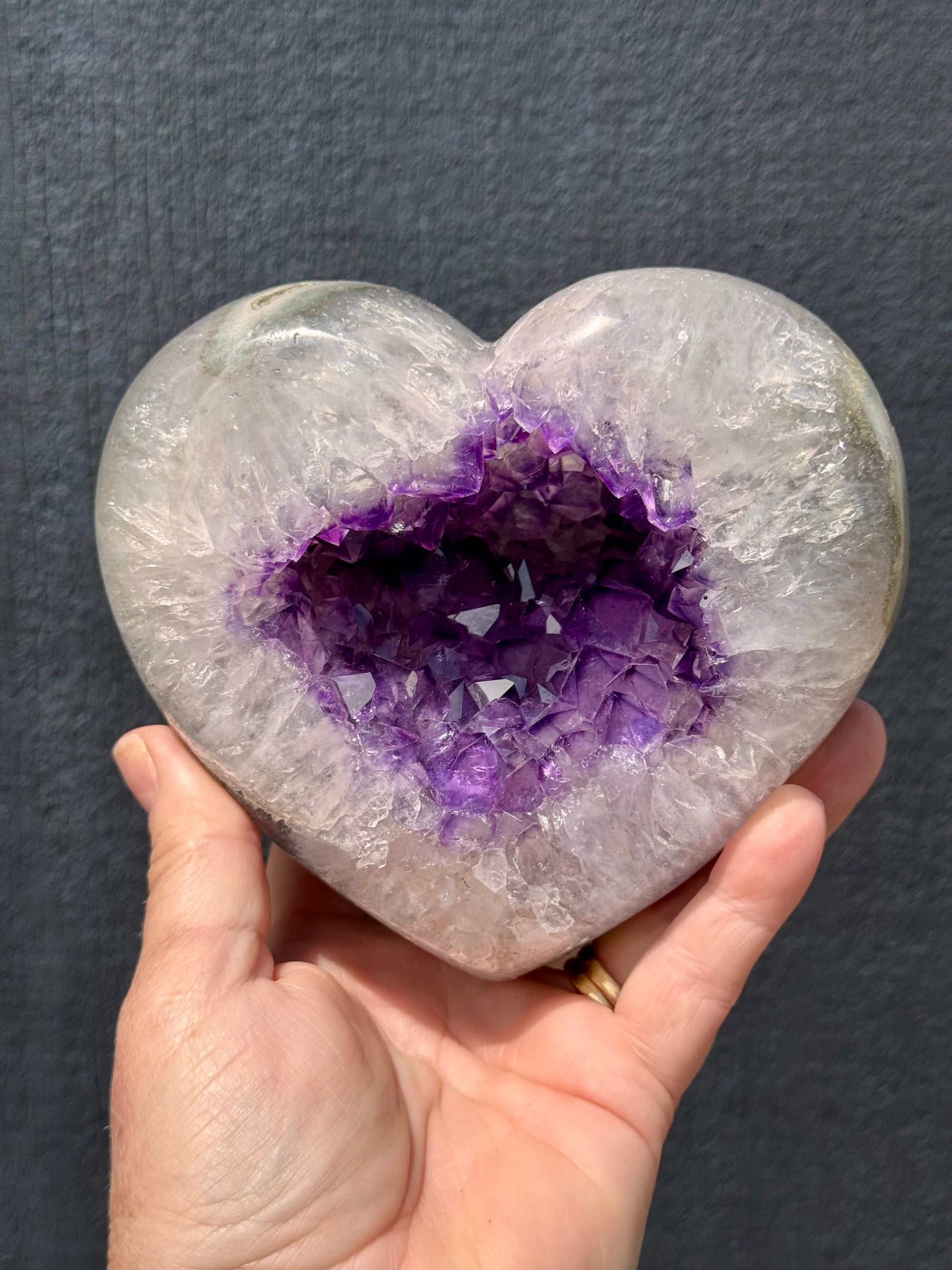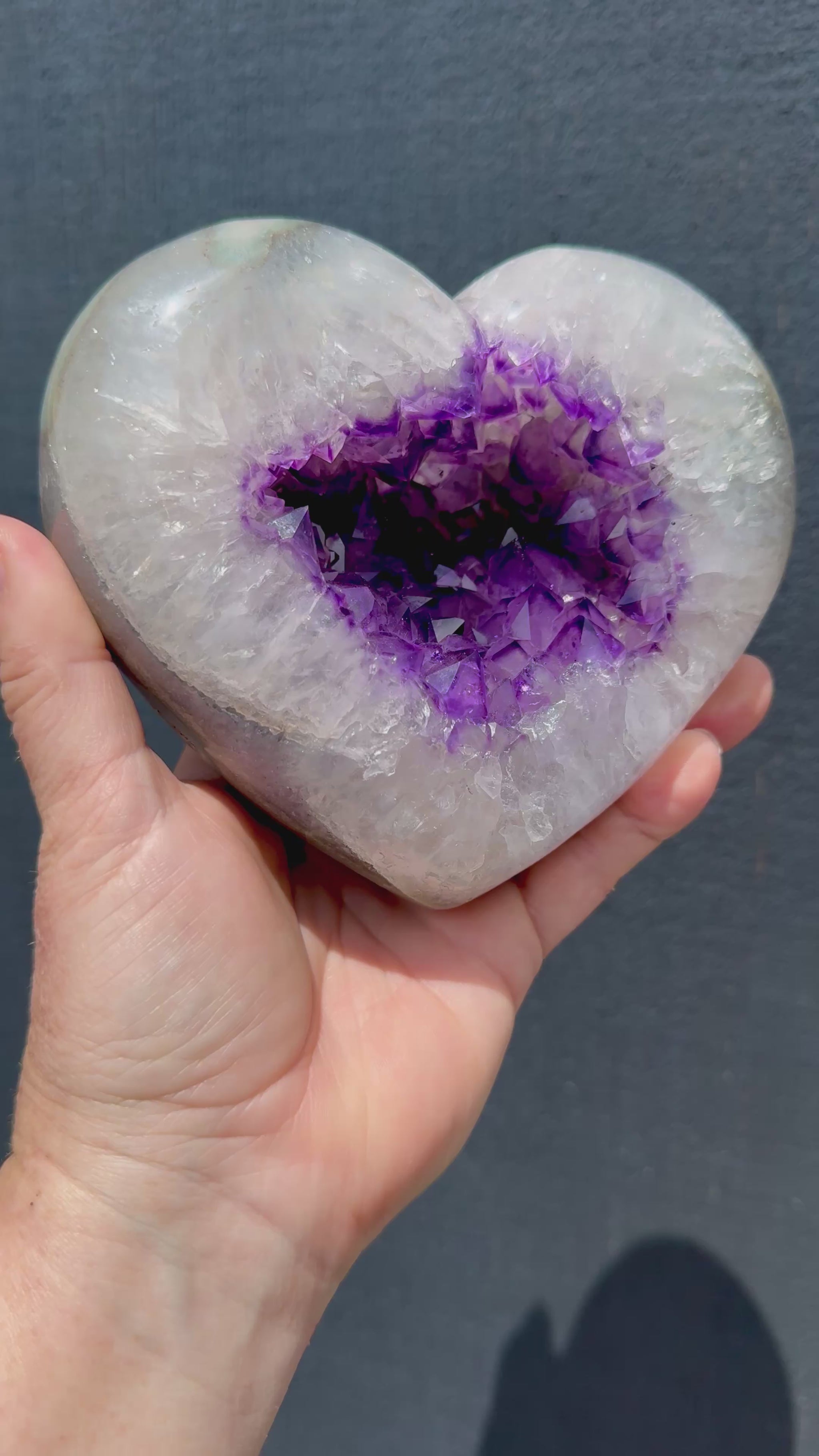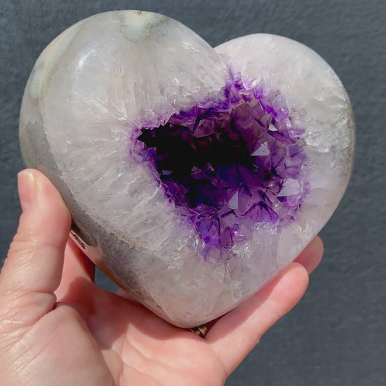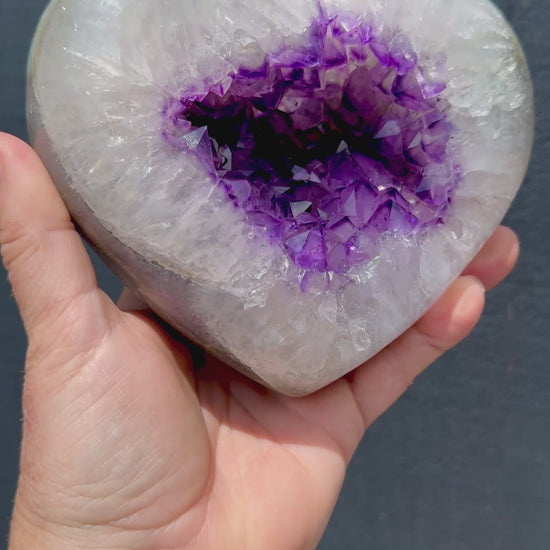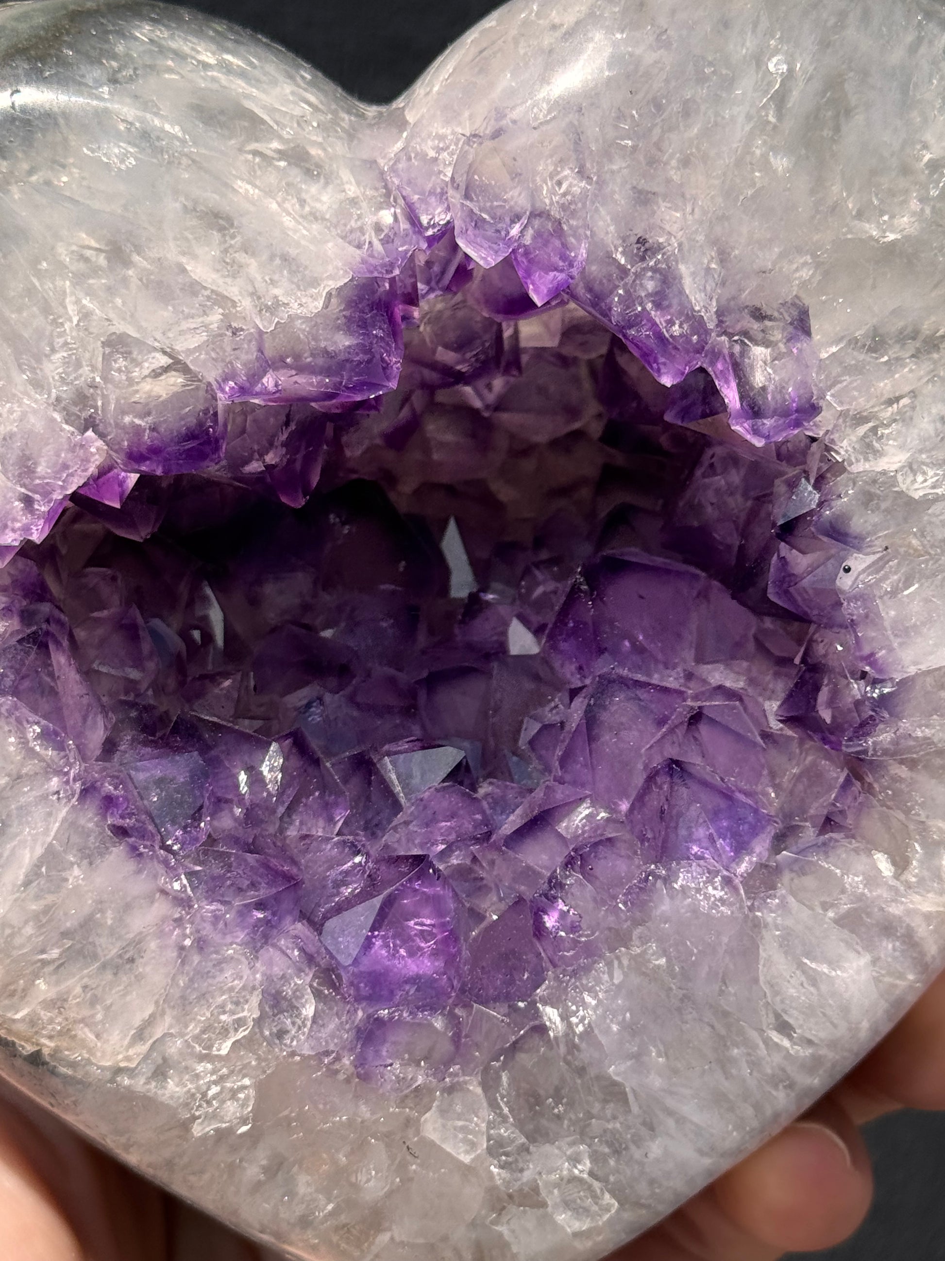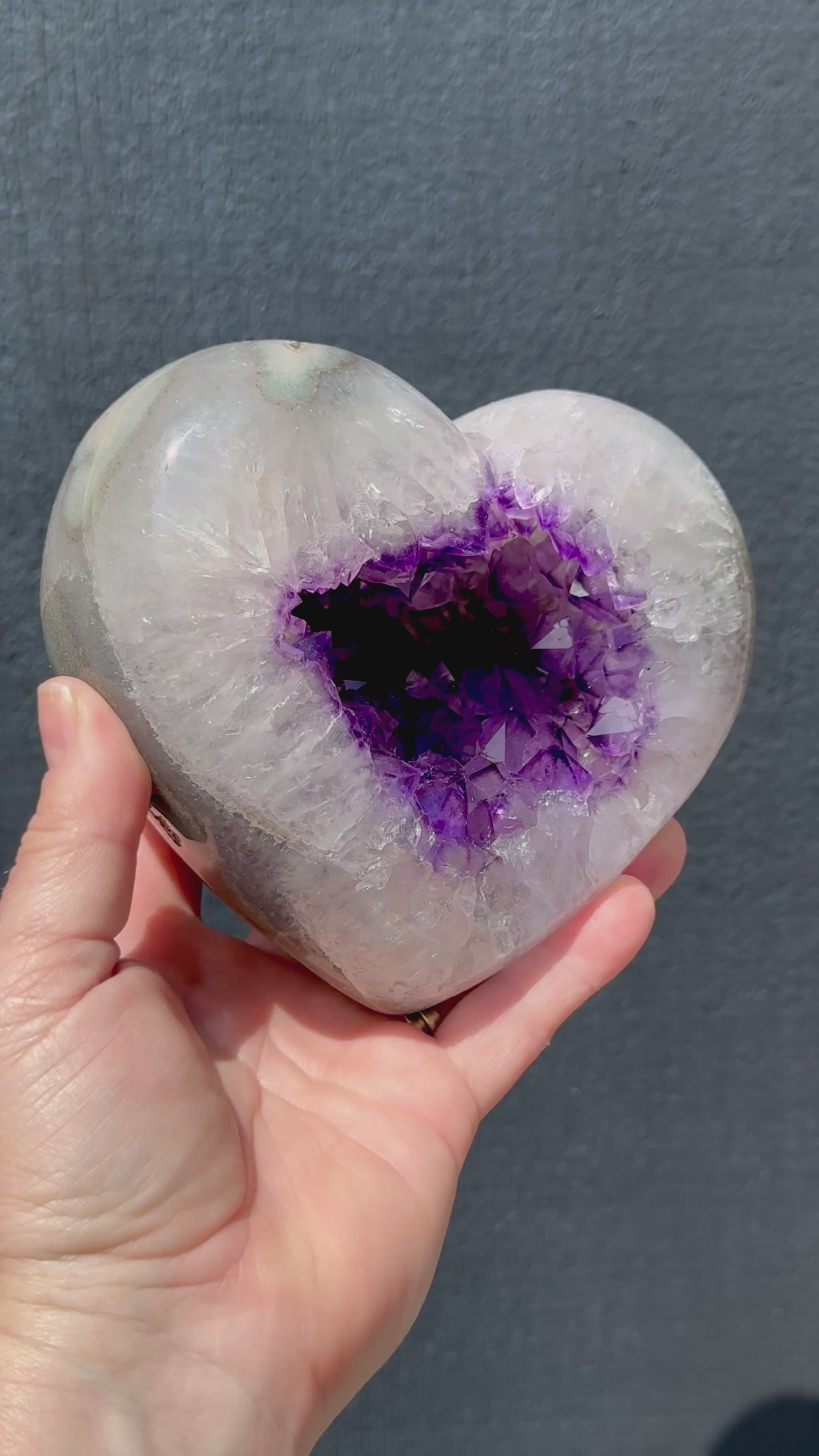 Elevate your space with this high-grade large Uruguayan Amethyst Geode cluster heart, featuring rich big, vibrant purple crystals in a deep geode pocket that naturally sparkles and catches the light. Carefully mounted on a custom stand, it’s a striking display piece perfect for your home, office, or altar. This beautiful heart is perfect for collectors or as a thoughtful gift, while bringing the calming energy and beauty of genuine Uruguayan Amethyst into any setting.