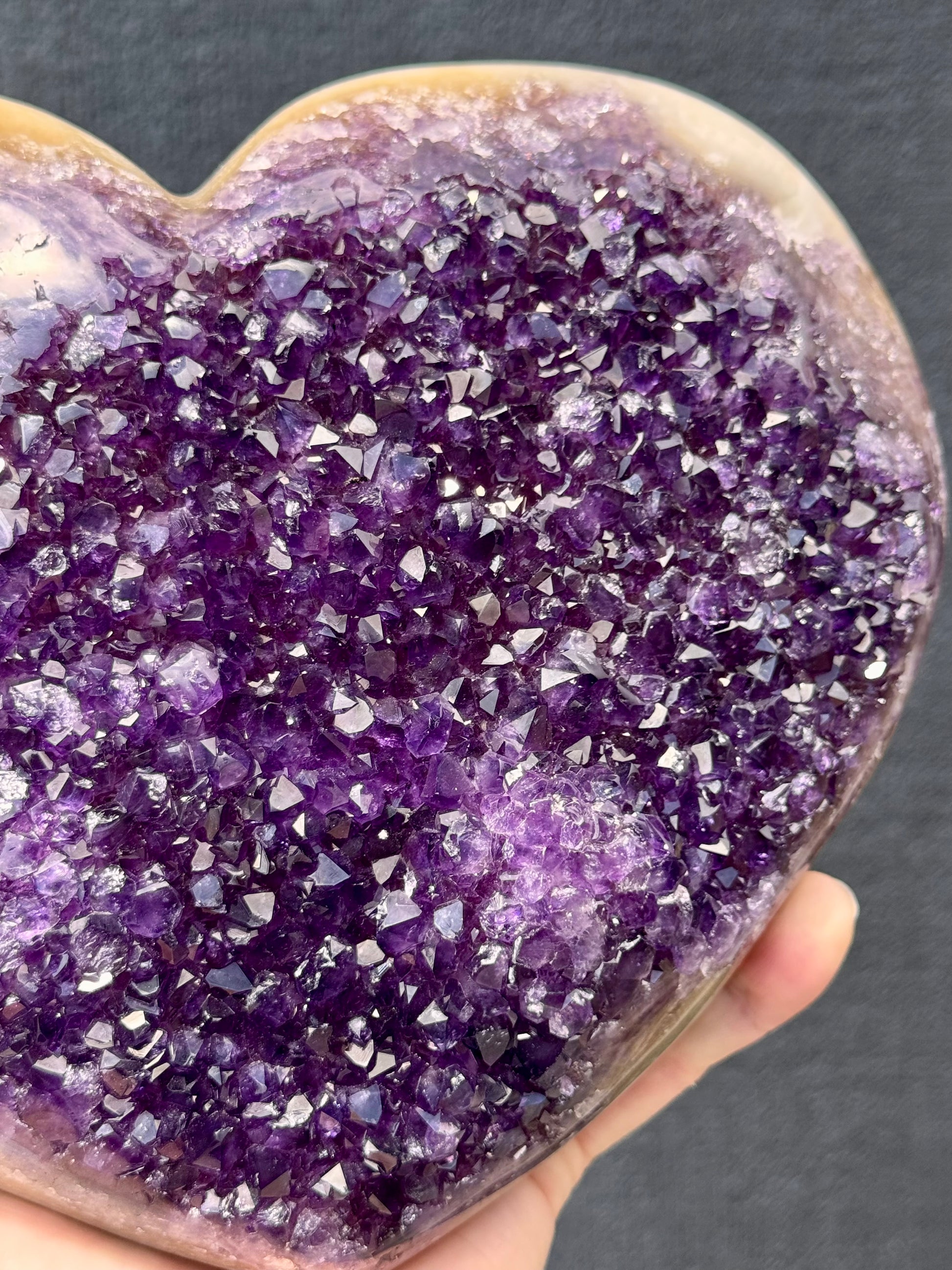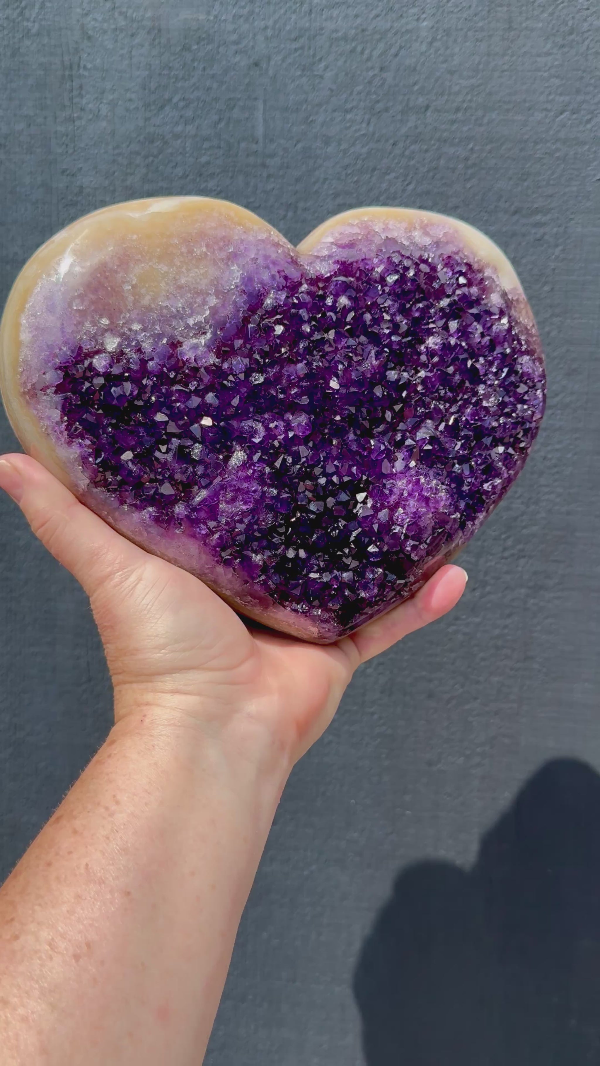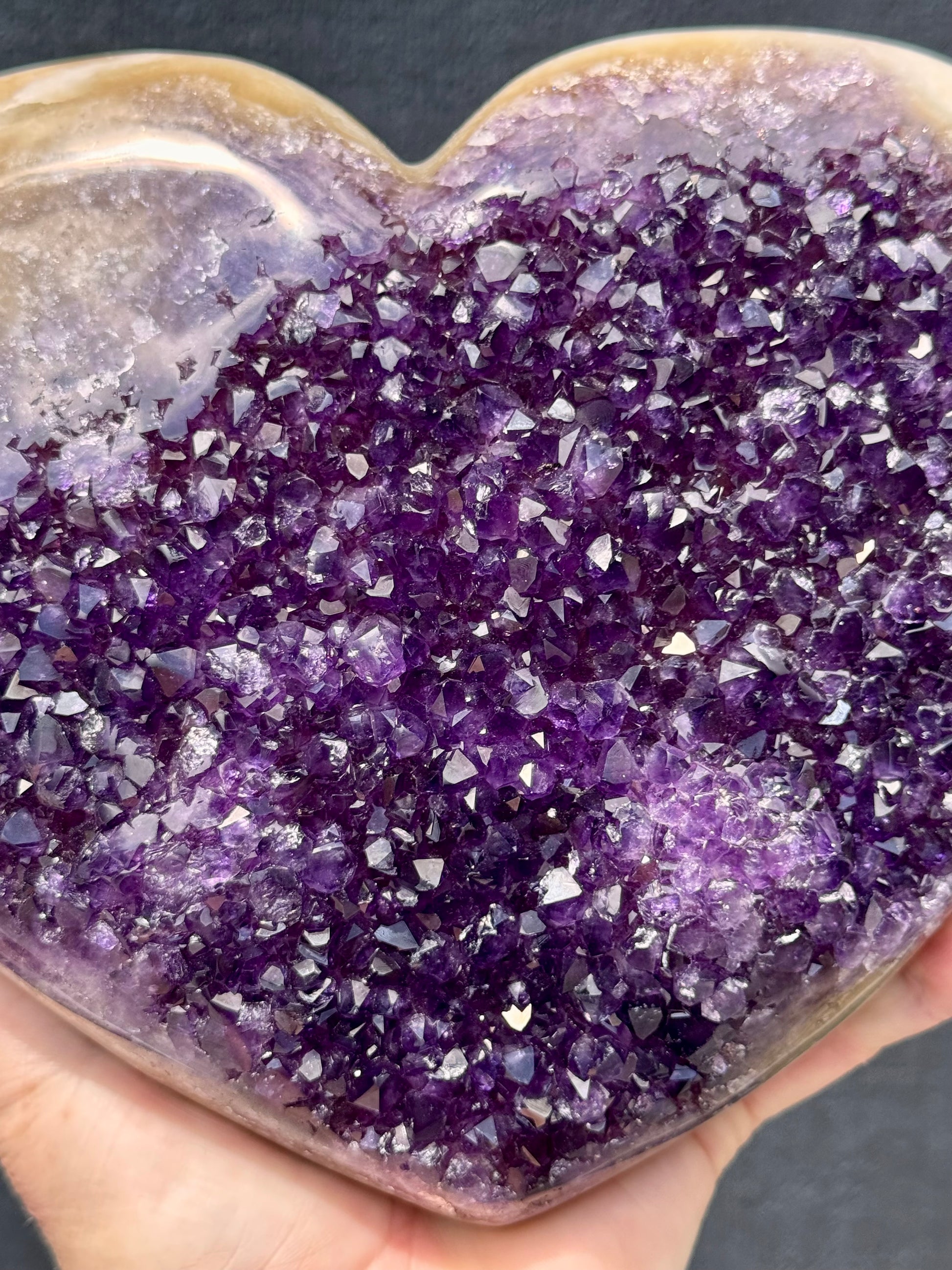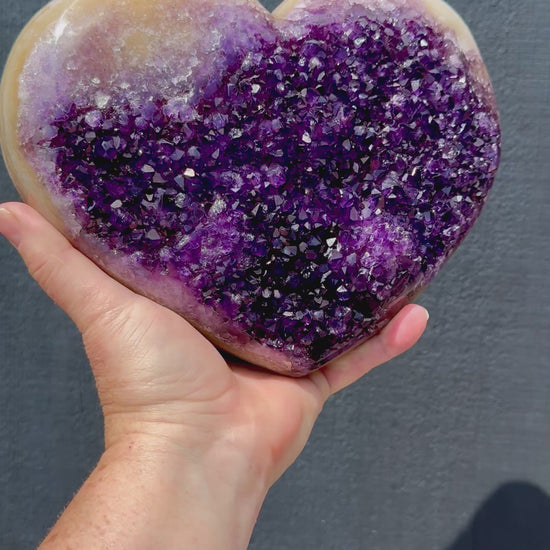 Elevate your space with this high-grade extra large Uruguayan Amethyst cluster heart, featuring rich, vibrant purple crystals that naturally sparkle and catch the light. Carefully mounted on a custom stand, it’s a striking display piece perfect for your home, office, or altar. This beautiful heart is perfect for collectors or as a thoughtful gift, while bringing the calming energy and beauty of genuine Uruguayan Amethyst into any setting.