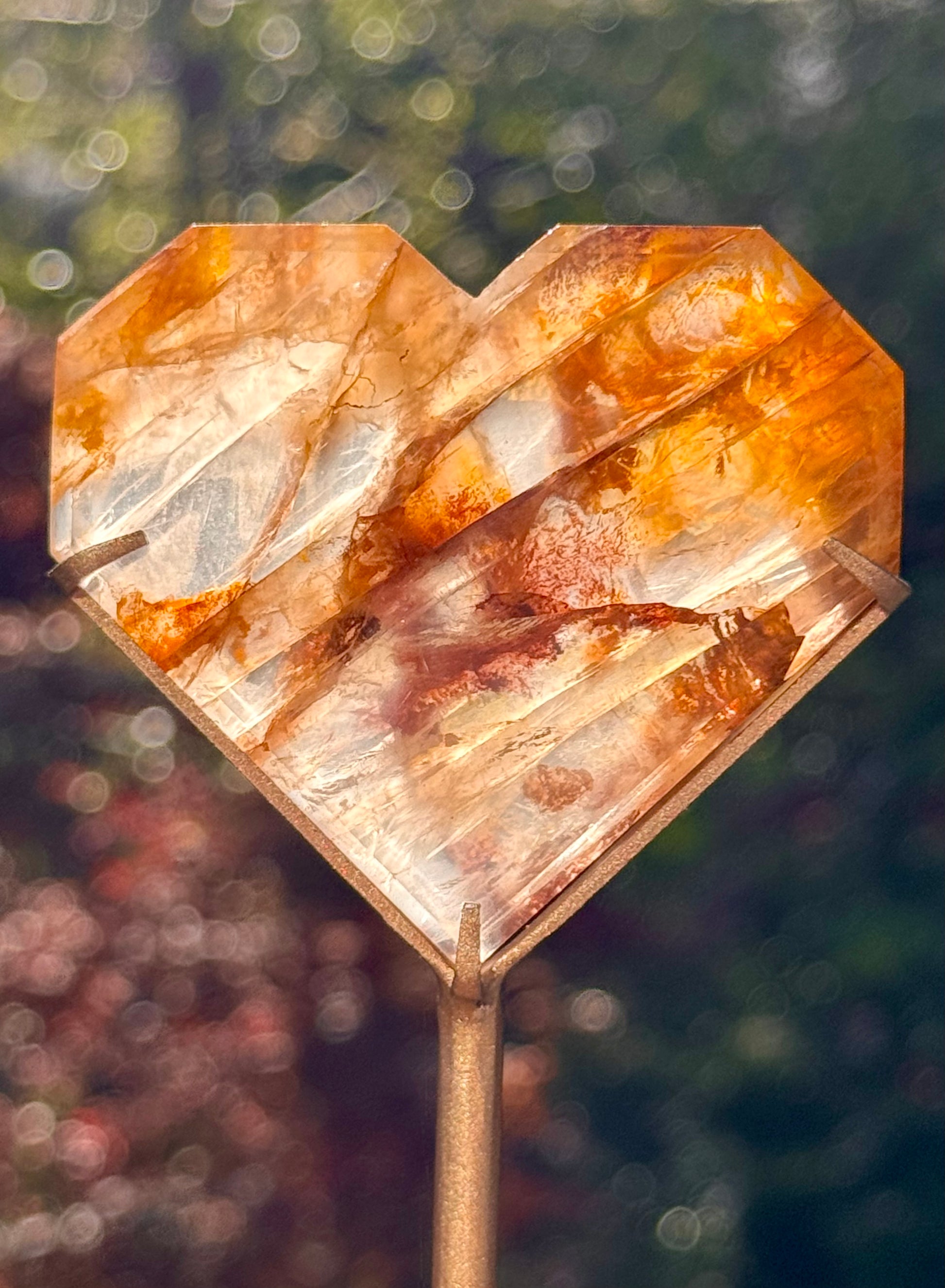 Golden Healer, Fire and Girasol Quartz Faceted Heart on a stand