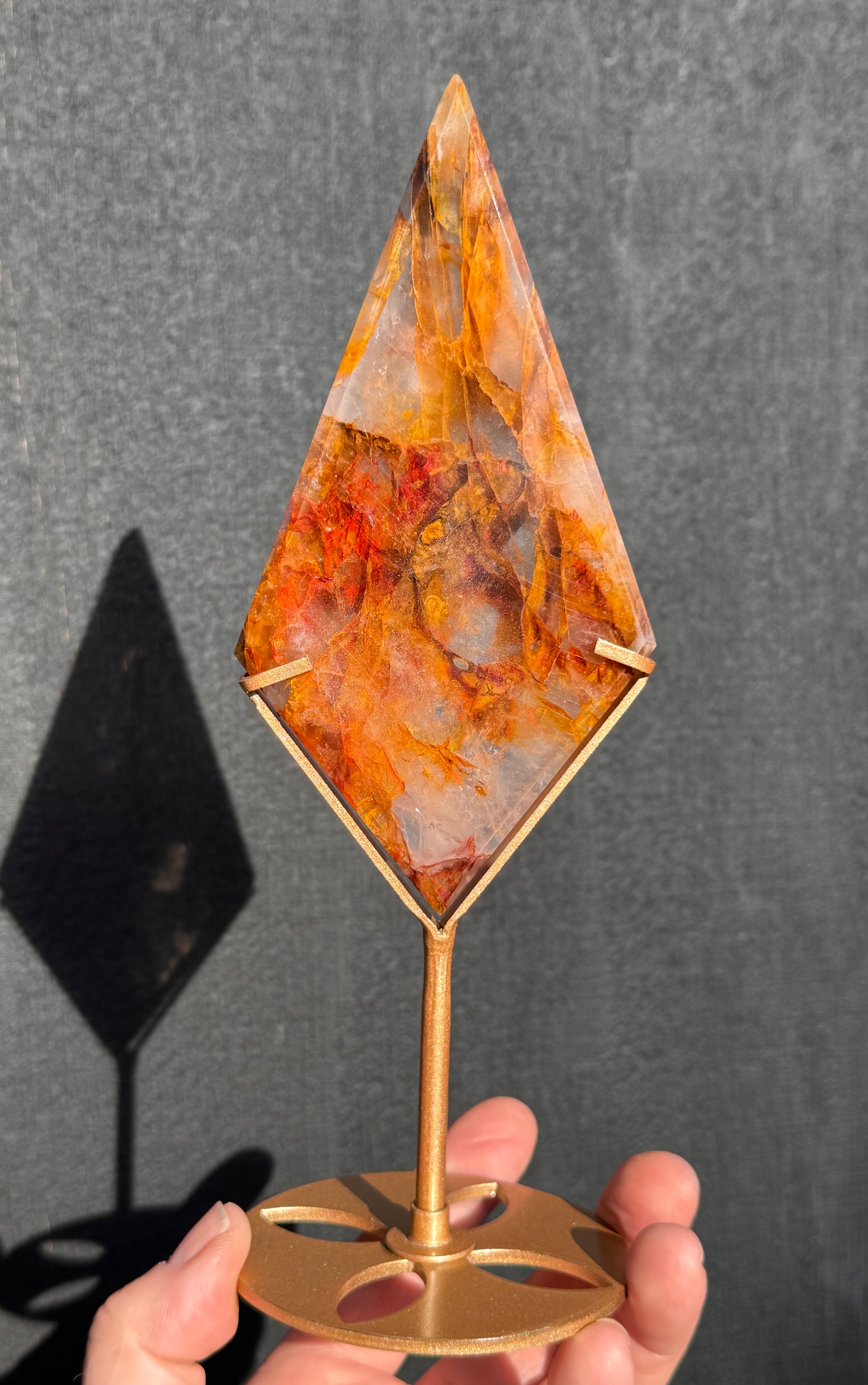 Stunning Golden Healer & Fire Quartz in Girasol Quartz Carved Diamond on Stand