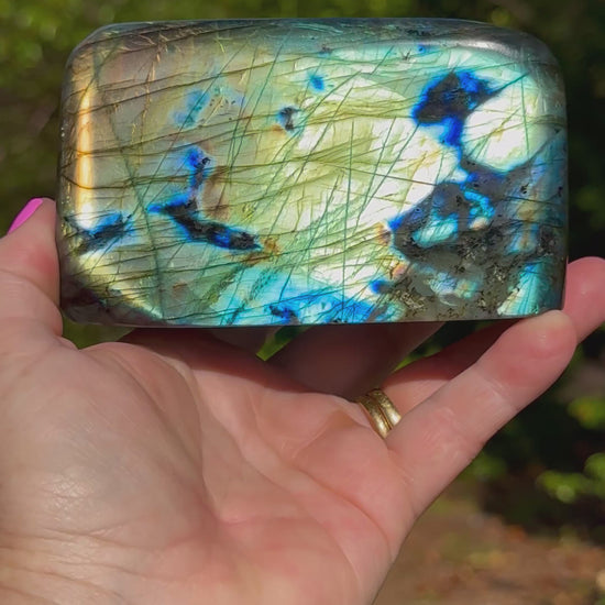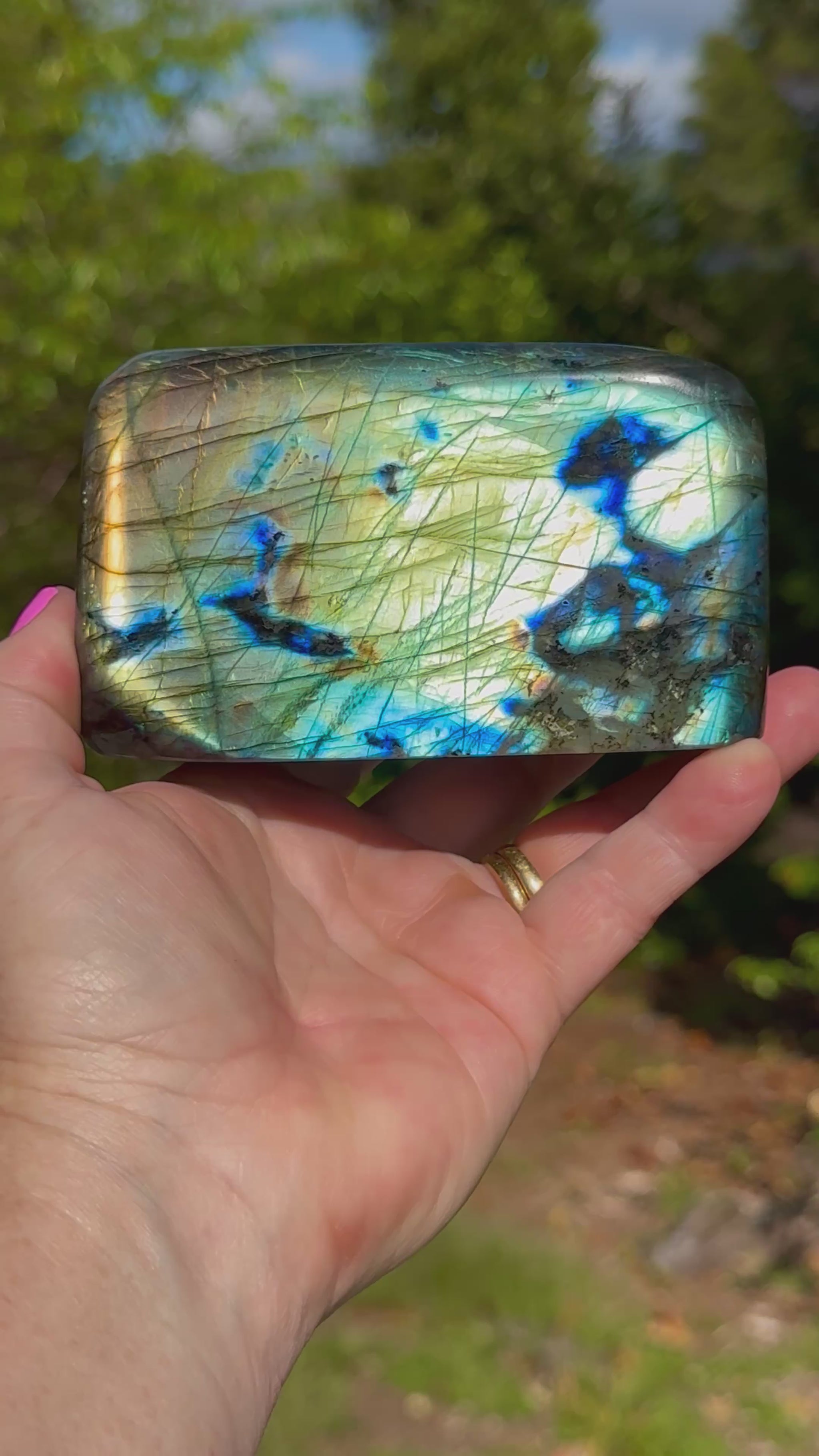 This flashy Labradorite freeform is a mesmerizing statement piece, shimmering with vibrant flashes of blue, gold, and green that shift with the light. Carved and polished to highlight its natural fire, this stone is known as the “Stone of Magic” — believed to enhance intuition, protection, and spiritual awareness. Each angle reveals a new play of colour, making it a captivating display piece for your home, altar, or workspace. A beautiful blend of grounding energy and mystical glow, this Labradorite brings both aesthetic beauty and soulful presence to any space.