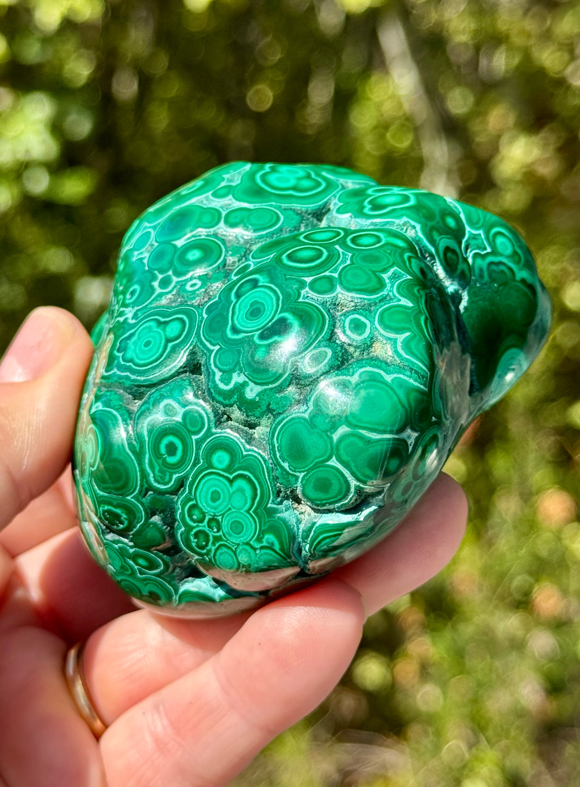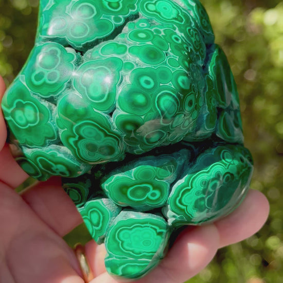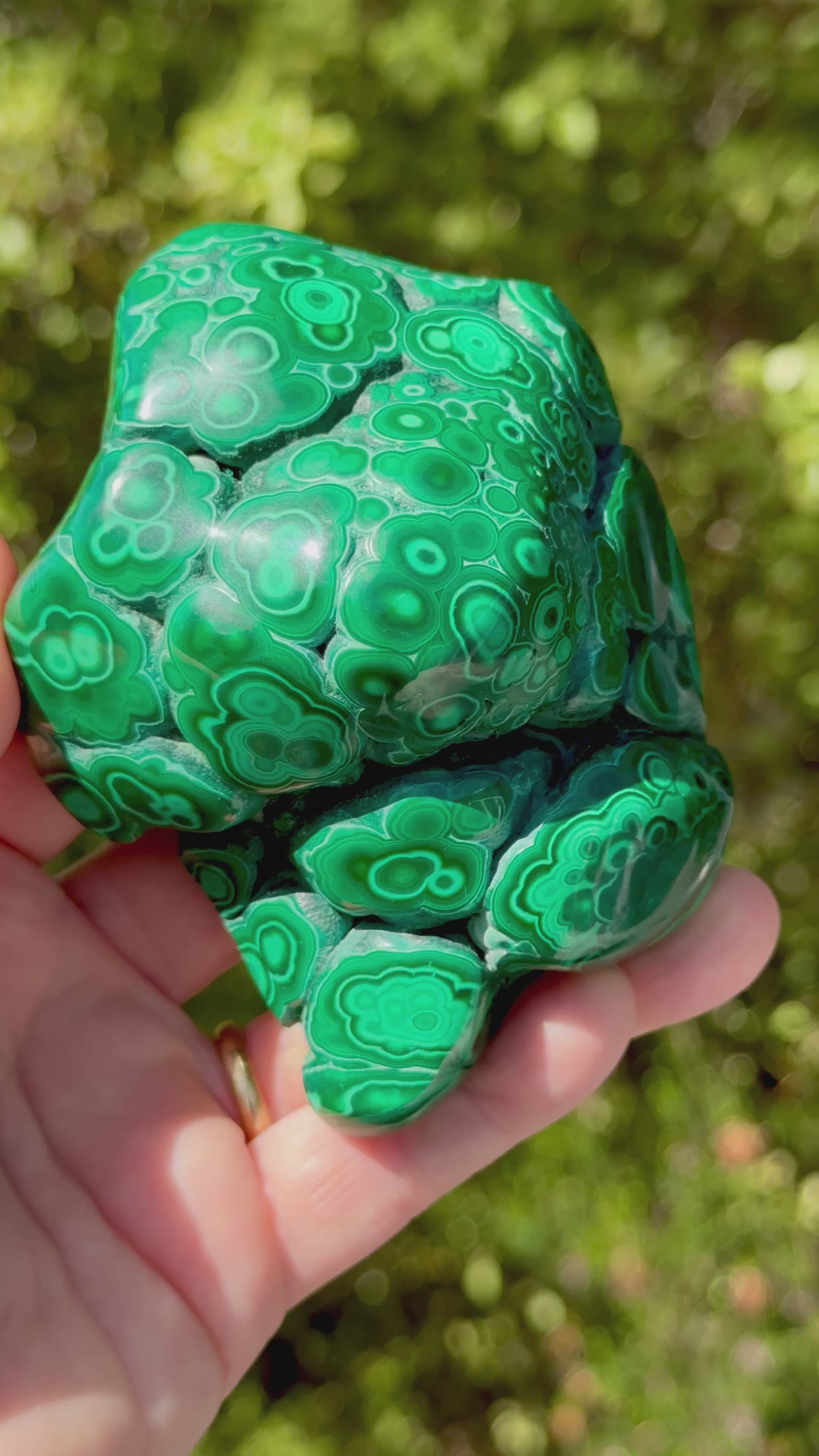 This beautiful high grade Malachite freeform from the Congo is a testament to nature's artistry, boasting polished surface that highlight its incredible Botryoidal and intricate formations. This is an incredible piece of Malachite for anyone collection