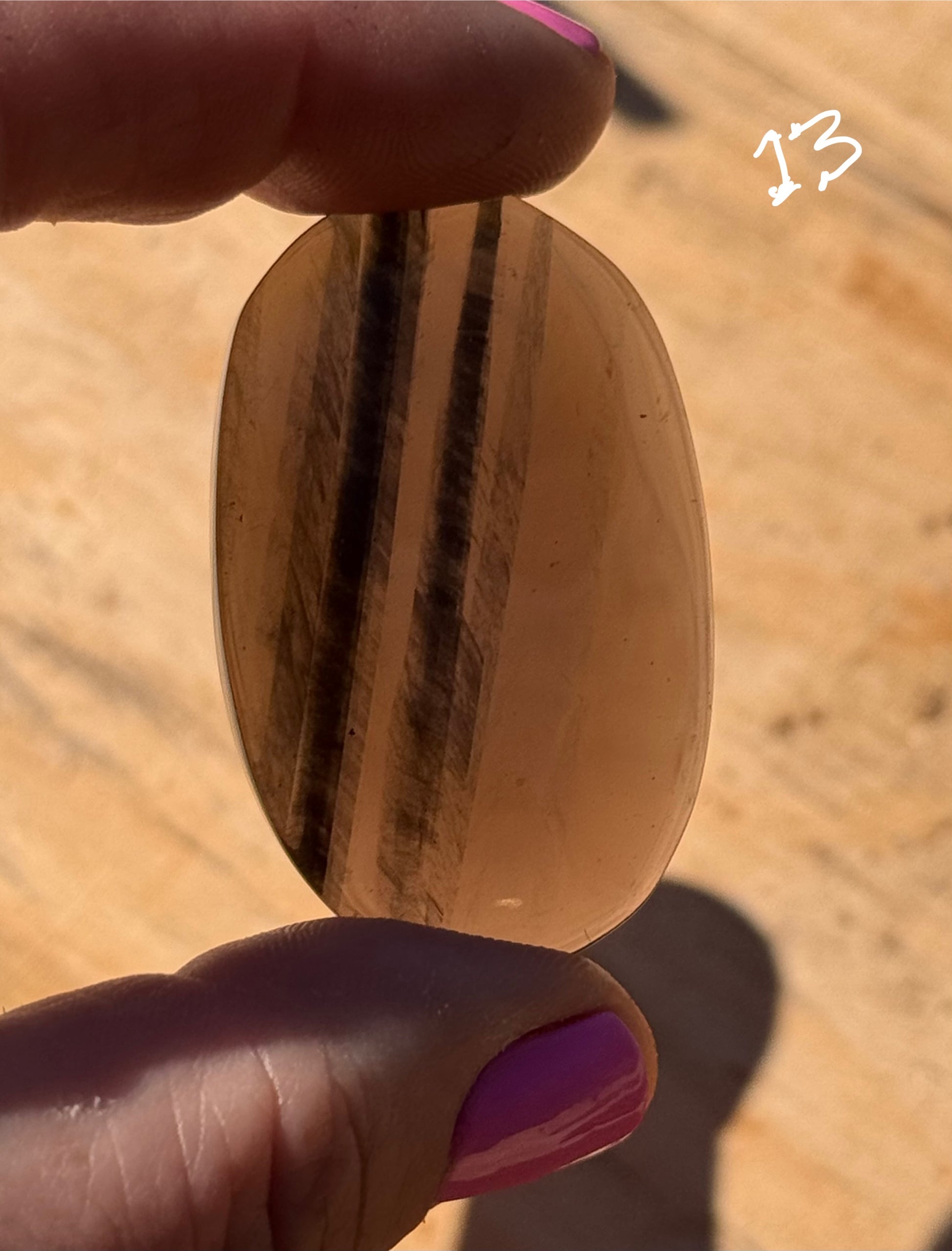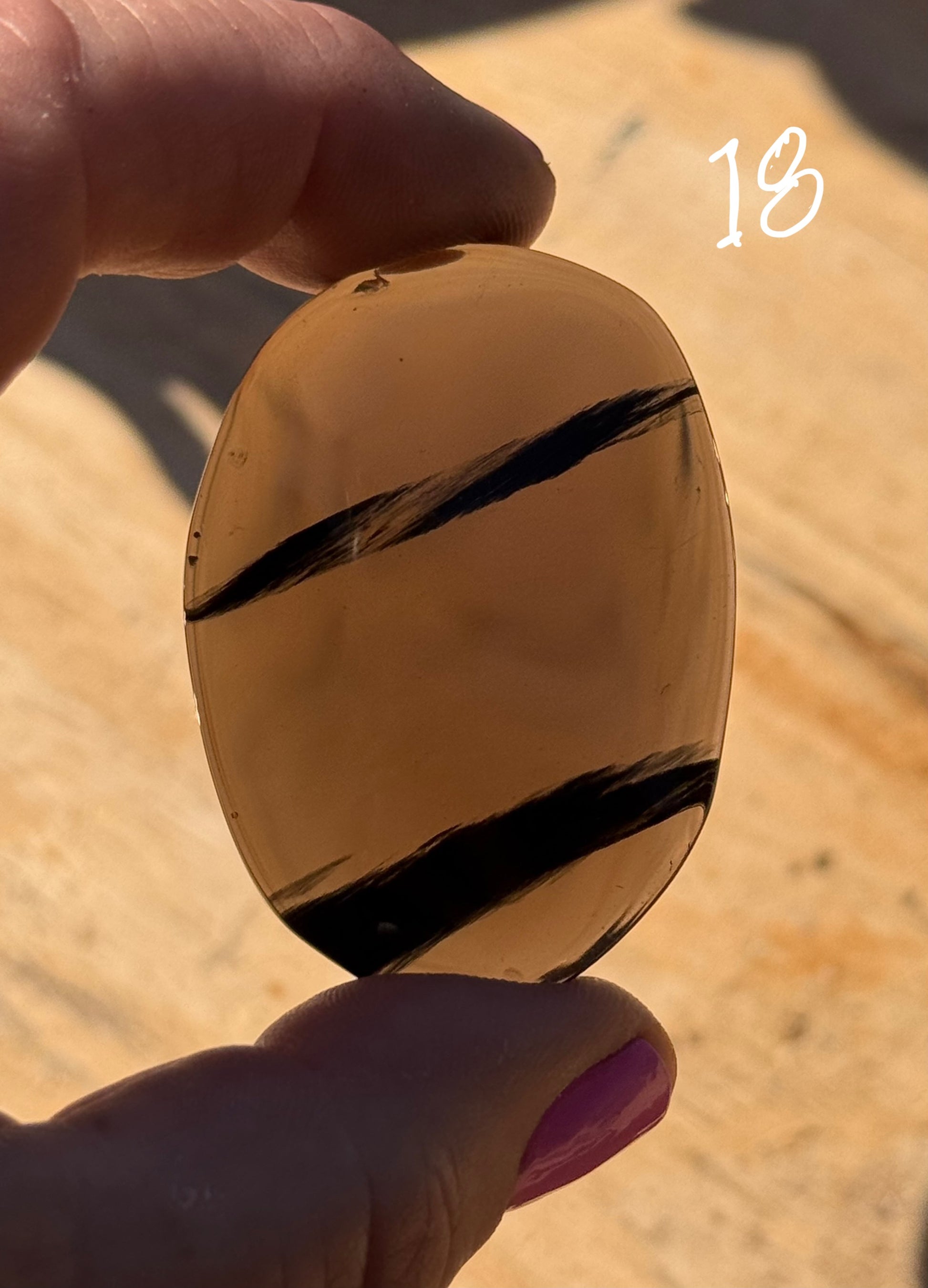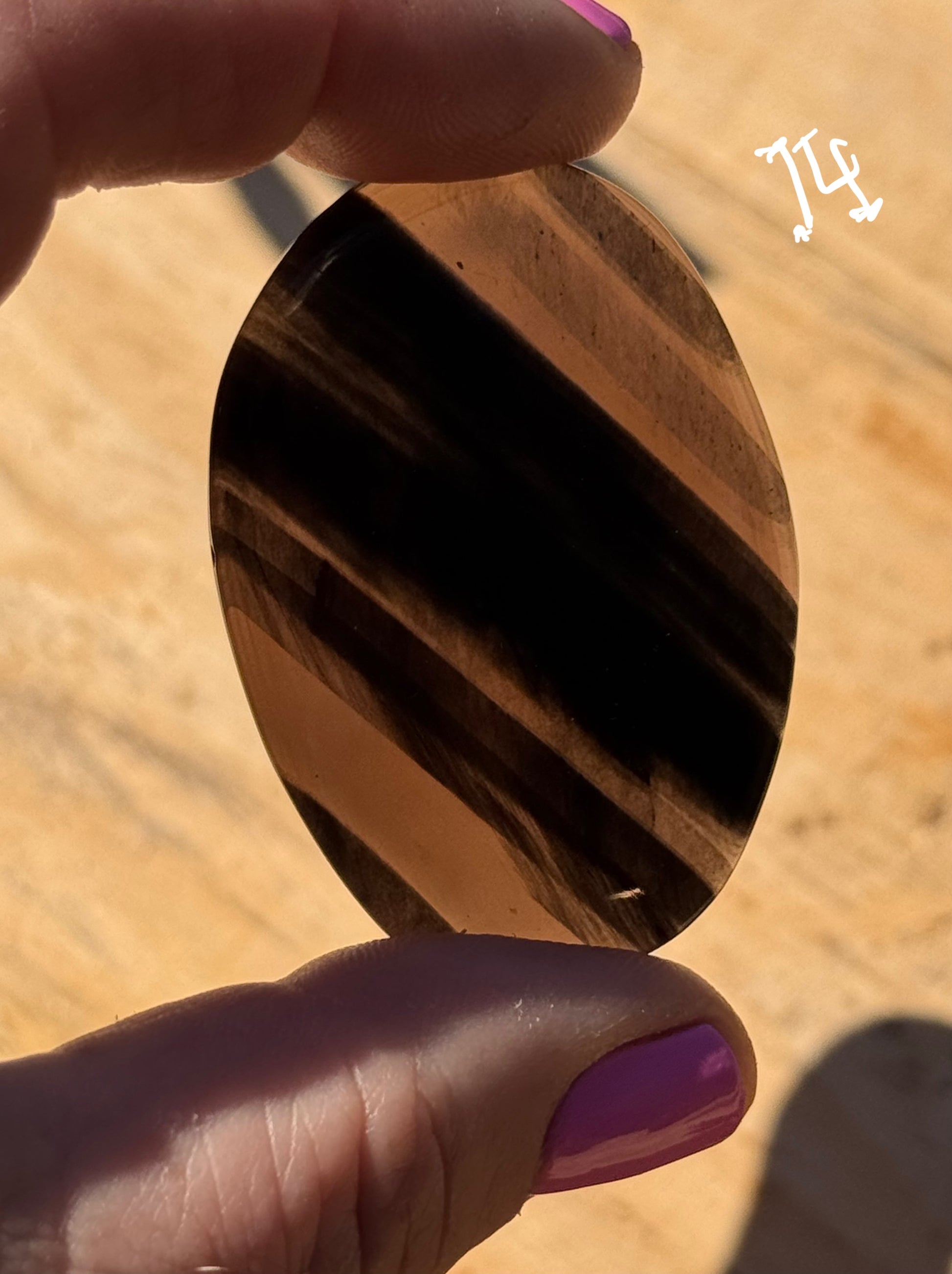 These Midnight Lace Obsidian palm stones show beautiful natural banding, created by layers of volcanic glass that formed as lava cooled. The alternating dark and translucent stripes give each piece a striking, ribbon-like appearance when held to the light. Smoothly polished to fit comfortably in the hand, each palm stone has its own unique pattern and depth, making them visually captivating and ideal for display or everyday carry.