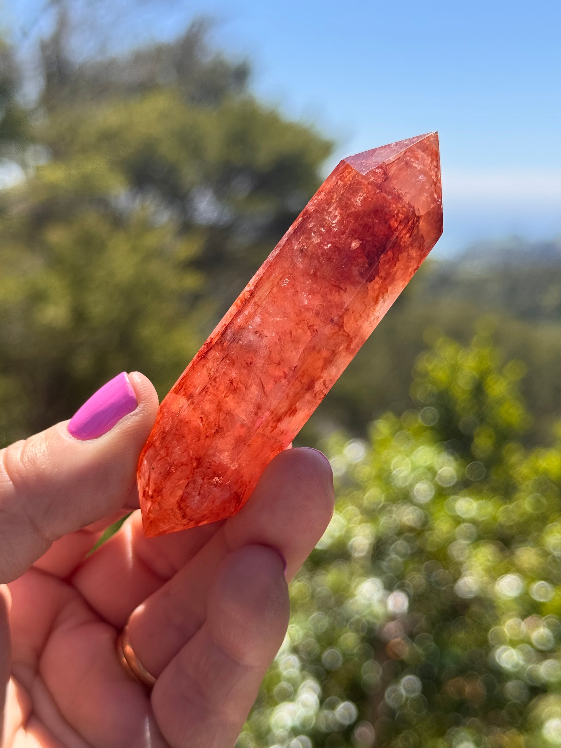 This Fire Quartz double terminated piece displays striking inclusions of hematite within clear to milky quartz, creating natural patterns of red, orange, and rust tones throughout the stone. The double terminated formation means it has naturally developed or been polished to feature a point at both ends, highlighting the internal colour zoning and structure from every angle. Each Fire Quartz piece is unique, with its own distinct combination of clarity, depth, and patterning, making this a captivating mineral specimen for display or collection.