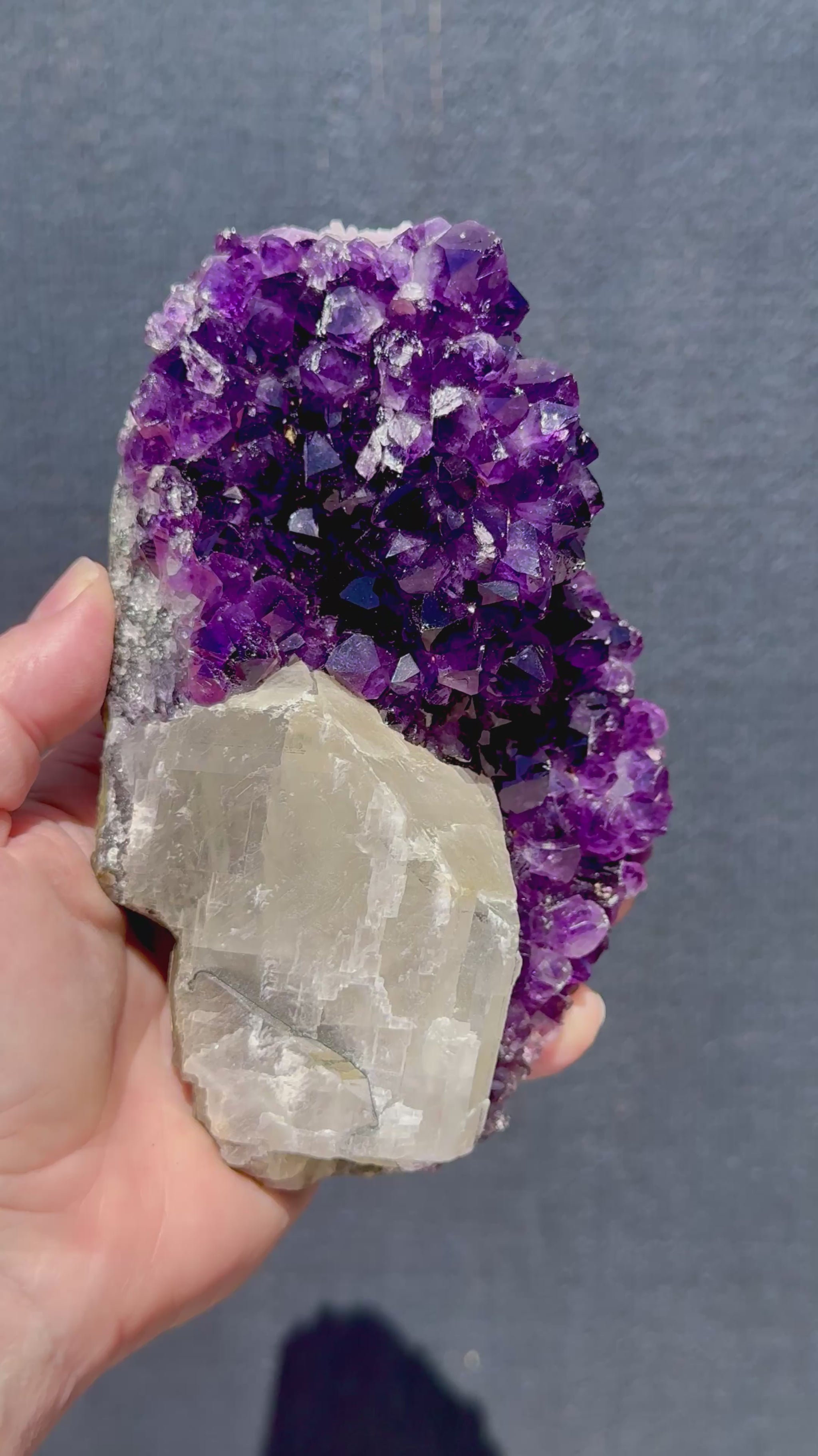 This stunning Amethyst from Uruguay showcases rich, deep purple crystal points that sparkle beautifully under the light. Nestled within the piece lies a striking natural calcite formation that full of rainbows, adding unique contrast and texture to the piece. The combination of Amethyst’s soothing, protective energy and Calcite’s uplifting, cleansing vibration makes this geode both visually captivating and energetically powerful. A true collector’s piece—perfect for display, meditation, or adding a touch of natural elegance to any space.