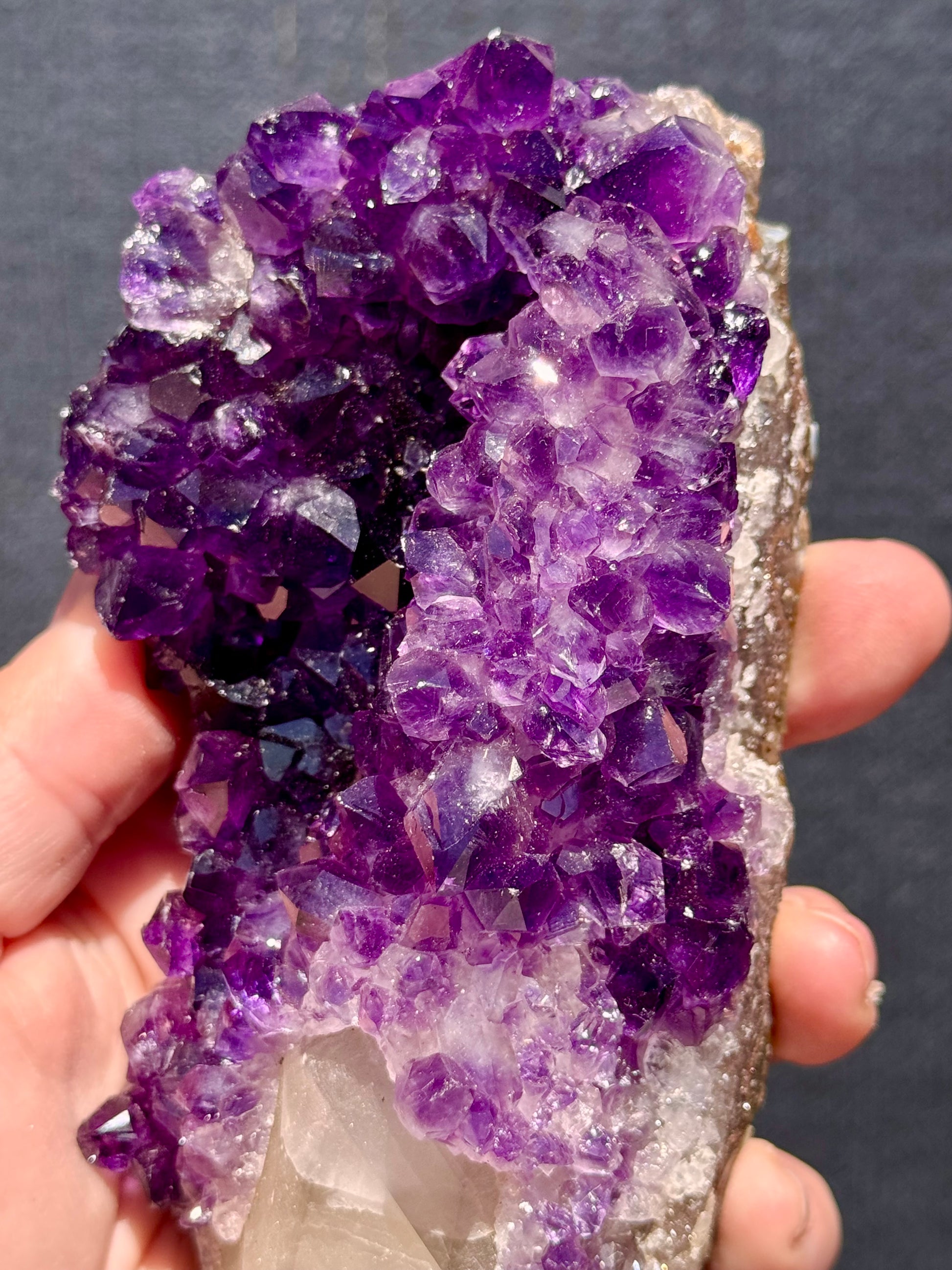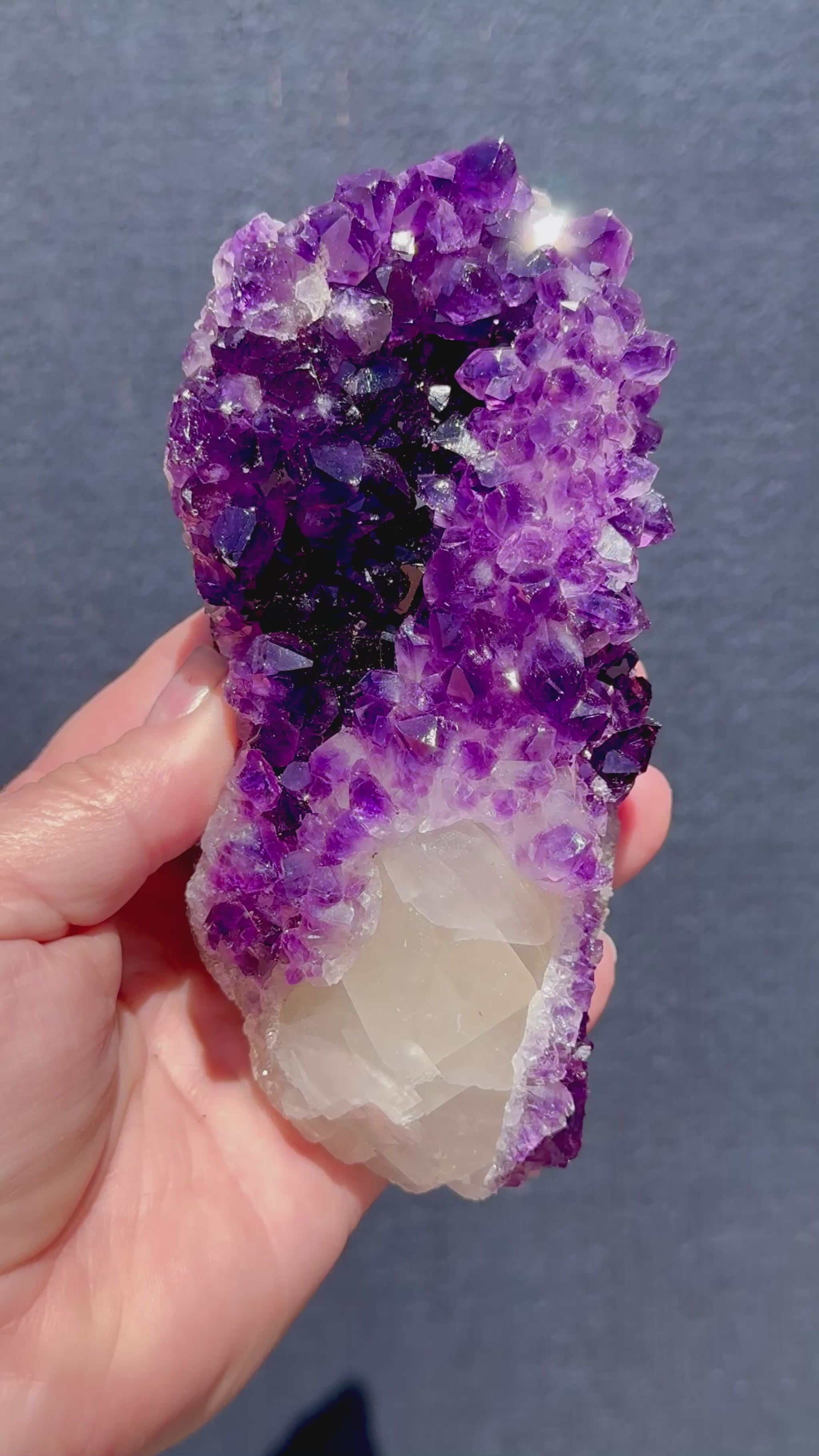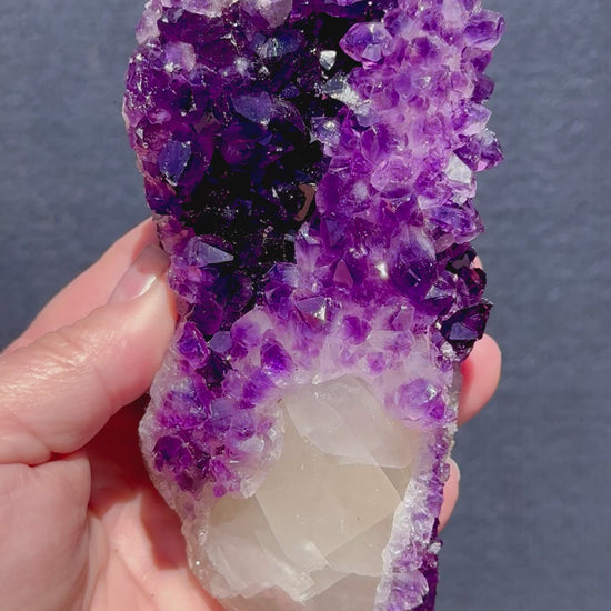 This stunning Amethyst from Uruguay features rich, deep purple crystal points that sparkle beautifully under the light. Running through the piece is a striking natural calcite formation that extends along its length with just the end exposed, the rest is surrounded by gorgeous Amethyst. The contrasting textures and tones create a truly captivating display.